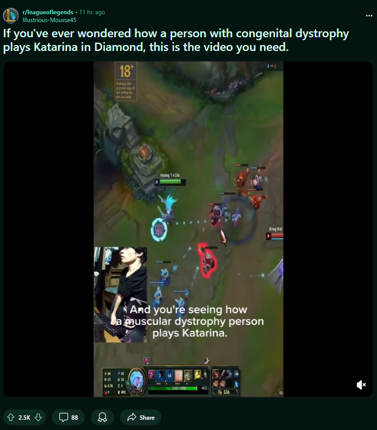 Mới đây, đoạn video Hoàng Khuyết TV sử dụng thuần thục Katarina trong các trận xếp hạng đã được chia sẻ lên diễn đàn Reddit của LMHT. Và video ngay lập tức nhận được sự thu hút lớn từ game thủ quốc tế và khiến họ không khỏi bội phục anh chàng vì nghị lực quá lớn của mình.