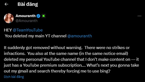 "Không có cảnh cáo hay vi phạm nào. Cùng lúc đó [trong cùng một email thông báo], Google cũng xóa kênh YouTube cá nhân của tôi mà tôi không tạo nội dung — kênh đó chỉ có đăng ký YouTube Premium. Tiếp theo là gì? Họ sẽ lấy Gmail của tôi à rồi buộc tôi phải sử dụng Bing sao?" cô nàng chỉ trích.