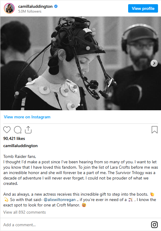 Tương lai của Tomb Raider đã được hé lộ với hai tựa game mới, cùng với một gương mặt diễn viên mới, Alix Wilton Regan, sẽ đảm nhận vai Lara Croft. Giờ đây, Camilla Luddington – người đã lồng tiếng cho Lara trong phiên bản làm lại năm 2013, cũng như Rise of the Tomb Raider và Shadow of the Tomb Raider – đã gửi lời chia tay đầy xúc động tới nhân vật huyền thoại này, đồng thời dành những lời chúc tốt đẹp tới nữ diễn viên kế nhiệm.