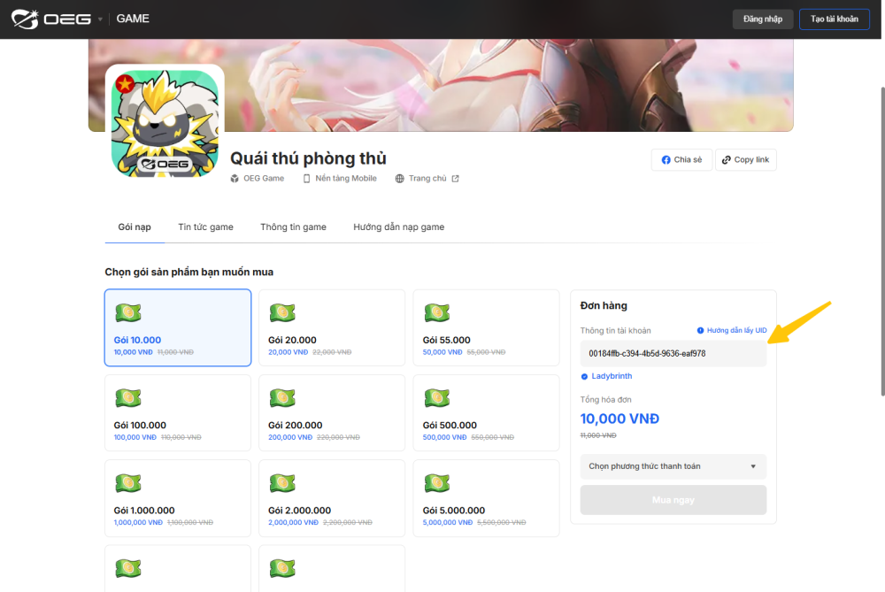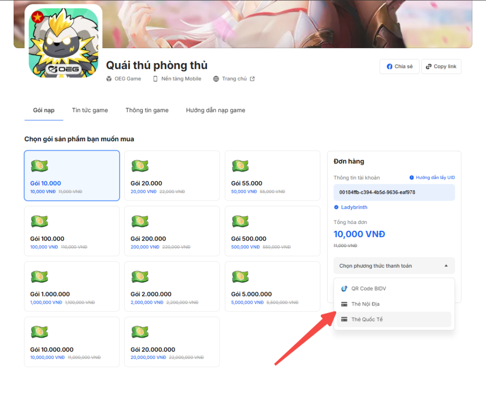 Bước 2: Truy cập vào Kênh nạp chính thức của OEG tại LINK → chọn Gói Vé Pal