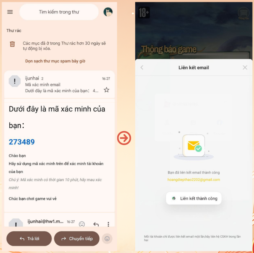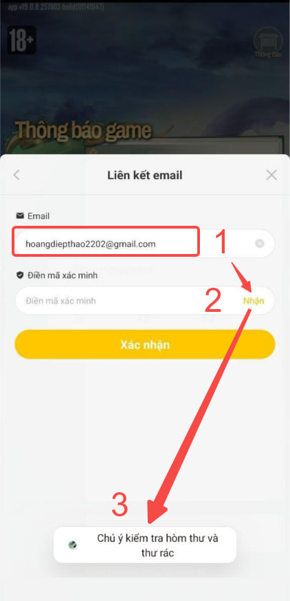 Khi có thông báo kiểm tra hòm thư là đã nhận mã thành công. Huynh/tỷ vào thư Gmail để lấy mã.