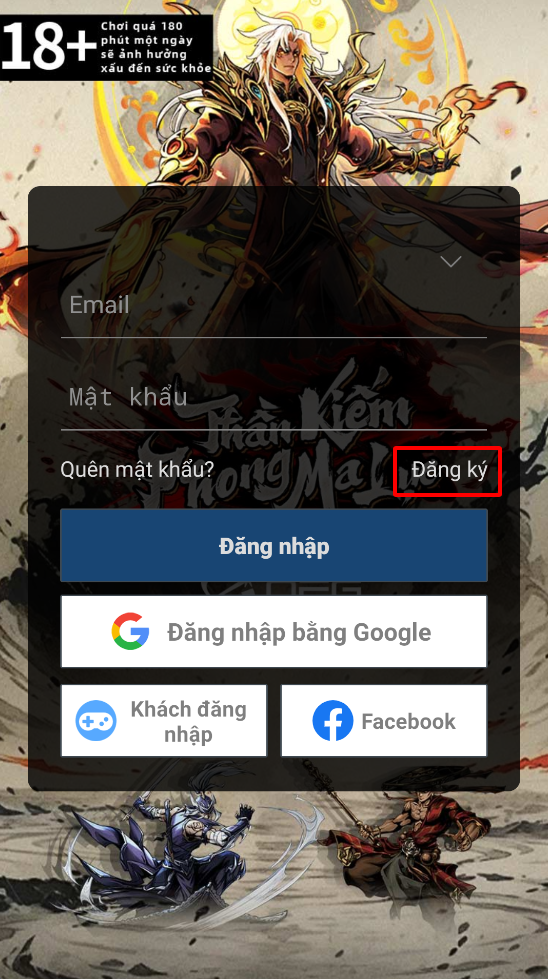Bước 1: Để đăng nhập bằng tài khoản của Thần Kiếm, trước tiên Hiệp Khách hãy chọn “Đăng ký” ở giao diện đăng nhập