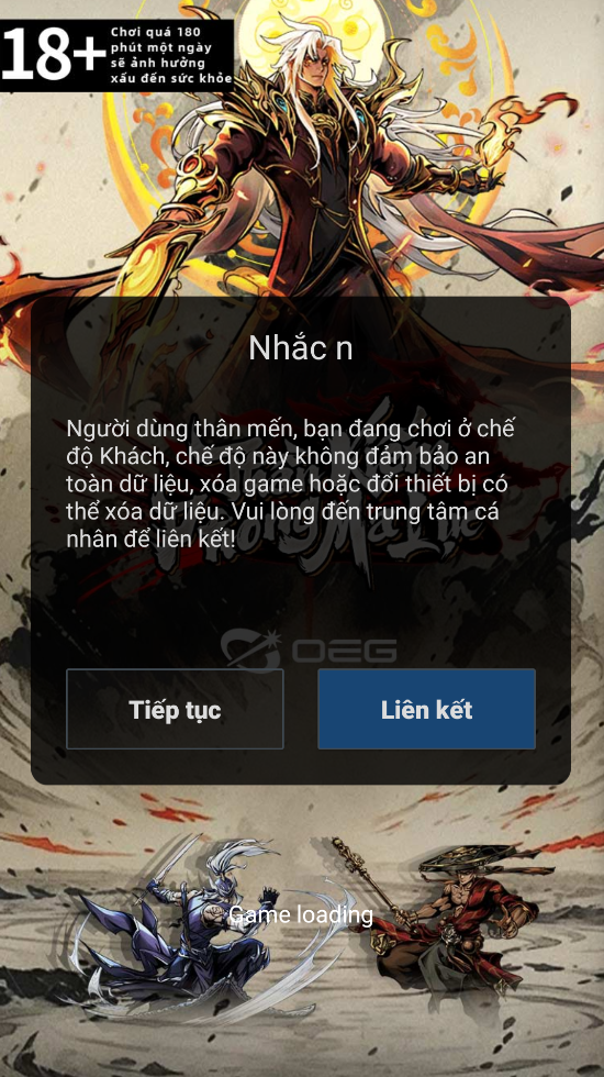 Đối với các tài khoản ở “Chế độ khách” thì trước khi tạo nhân vật hệ thống sẽ có thông báo nhắc nhở liên kết tài khoản để đảm bảo an toàn dữ liệu, Hiệp Khách cần liên kết tài khoản với 1 trong các phương thức được hỗ trợ để bảo vệ dữ liệu và đảm bảo Hiệp Khách có thể đăng nhập lại trên các thiết bị khác nếu gặp sự cố mất game, đổi máy, xóa app,...