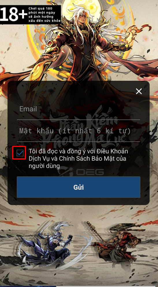 Bước 2: Nhập email và mật khẩu -> Tích chọn “Đồng ý Điều Khoản Dịch Vụ và Chính Sách Bảo Mật” -> Gửi