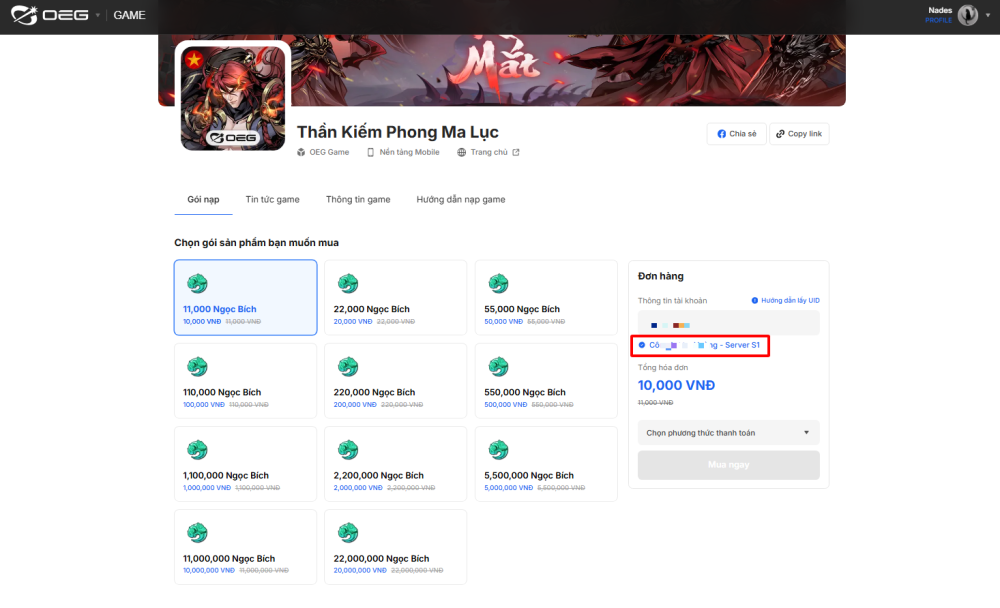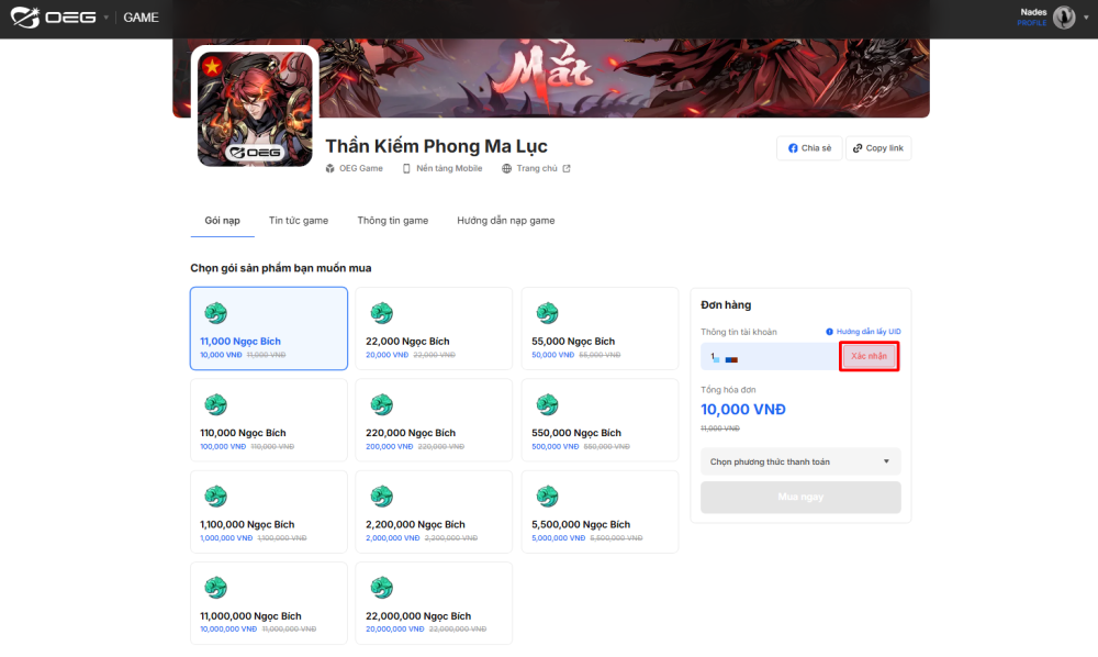 Bước 2: Chọn gói Ngọc Bích muốn nạp và nhập UID nhân vật