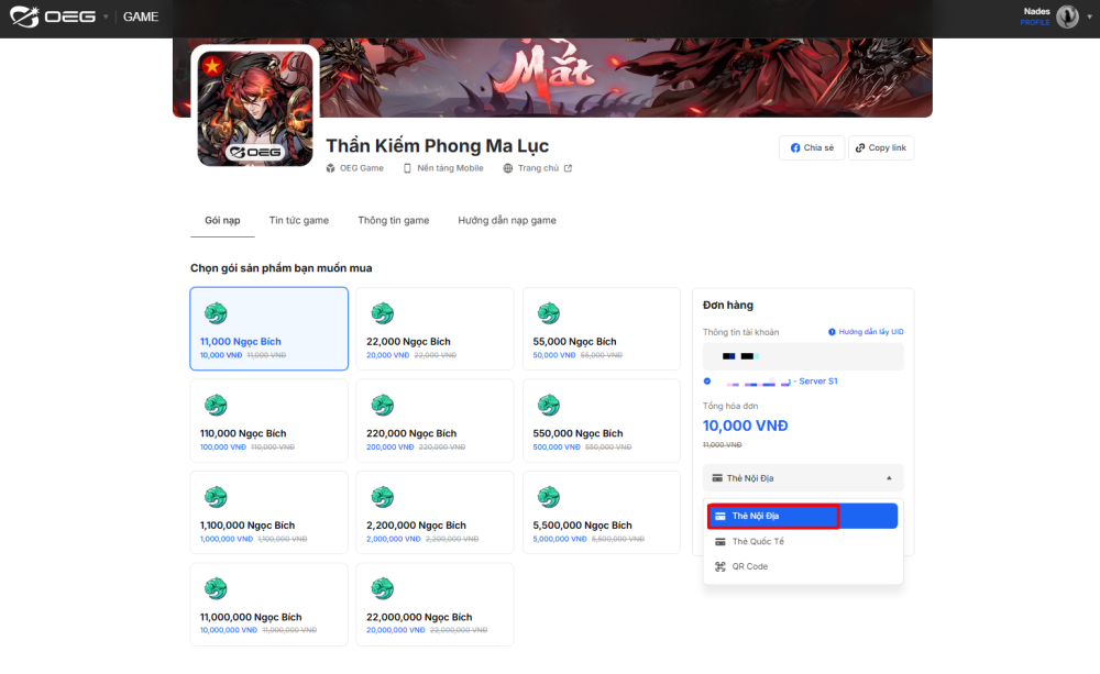Bước 3: Chọn phương thức thanh toán “Thẻ Nội Địa” và bấm “Mua ngay”