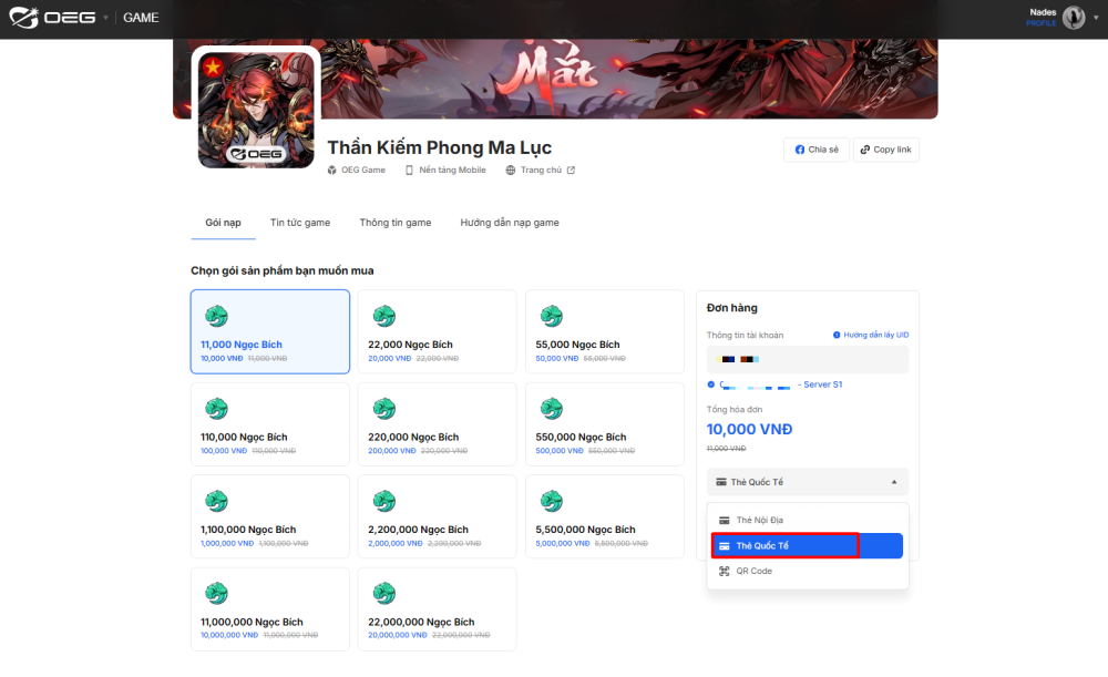 3, Nạp thẻ bằng Thẻ Quốc Tế